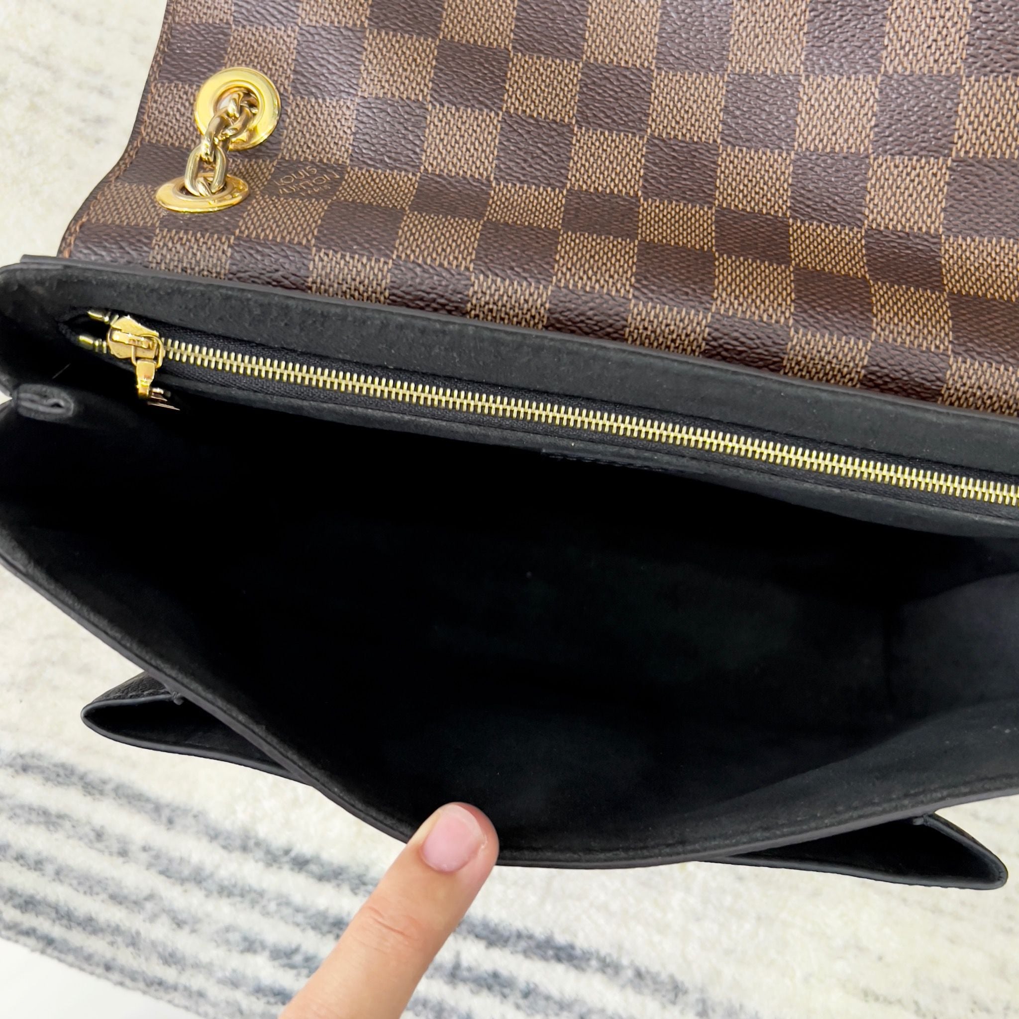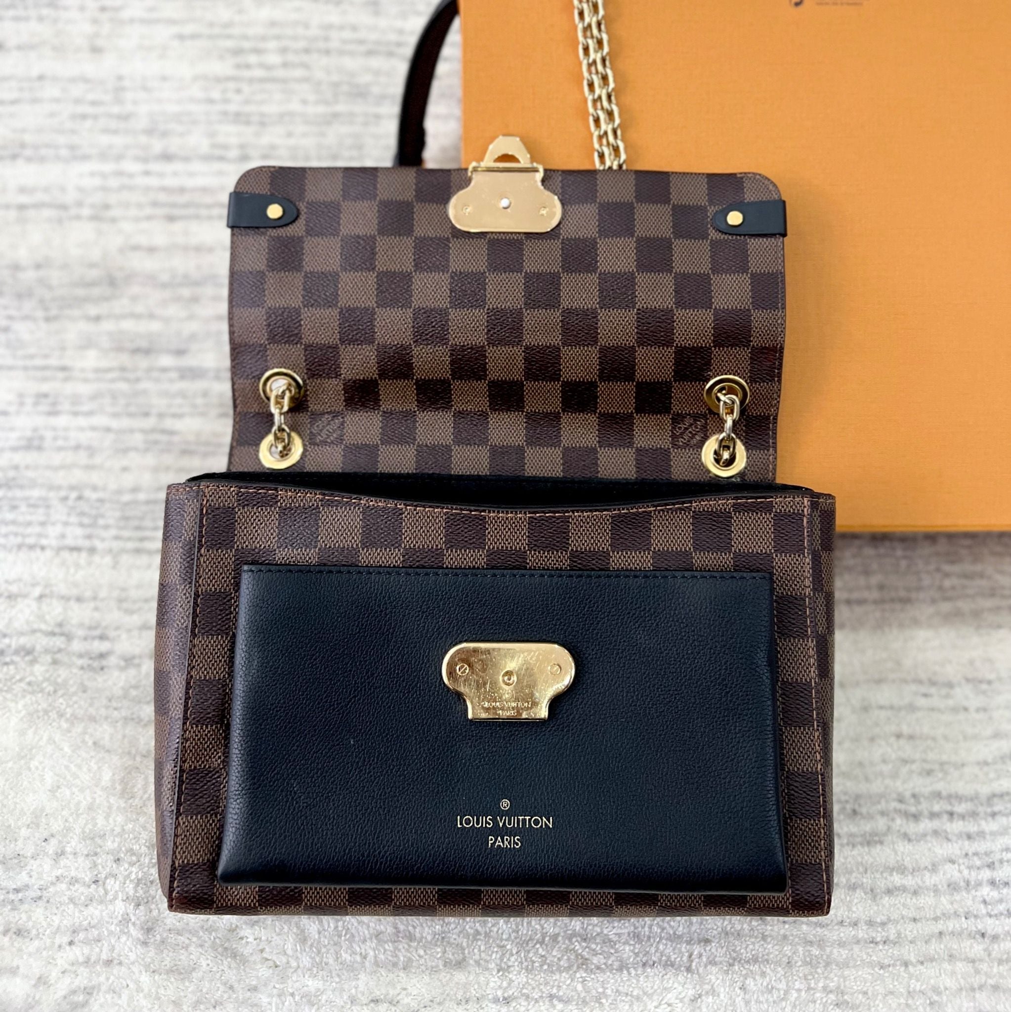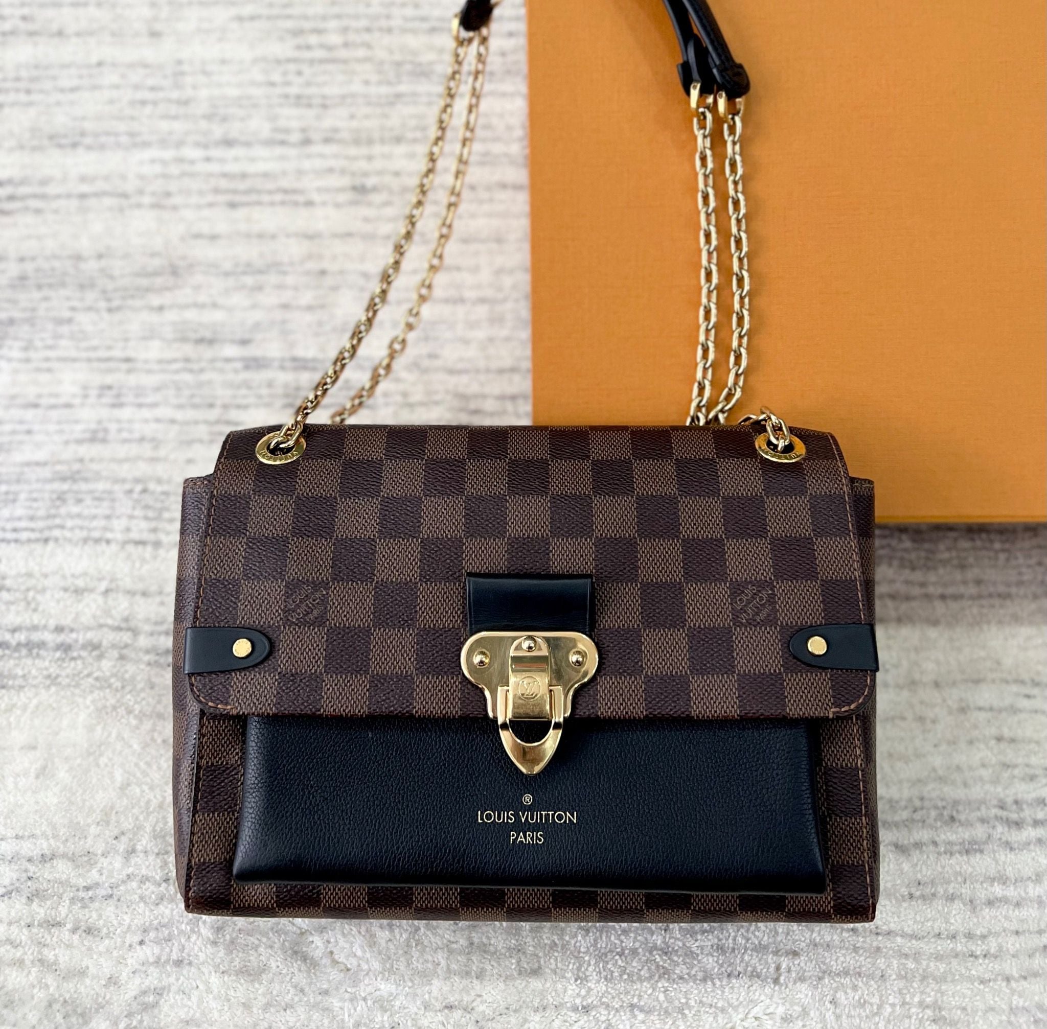 - Chất liệu Damier Ebene Canvas và da bò có vân nhỏ